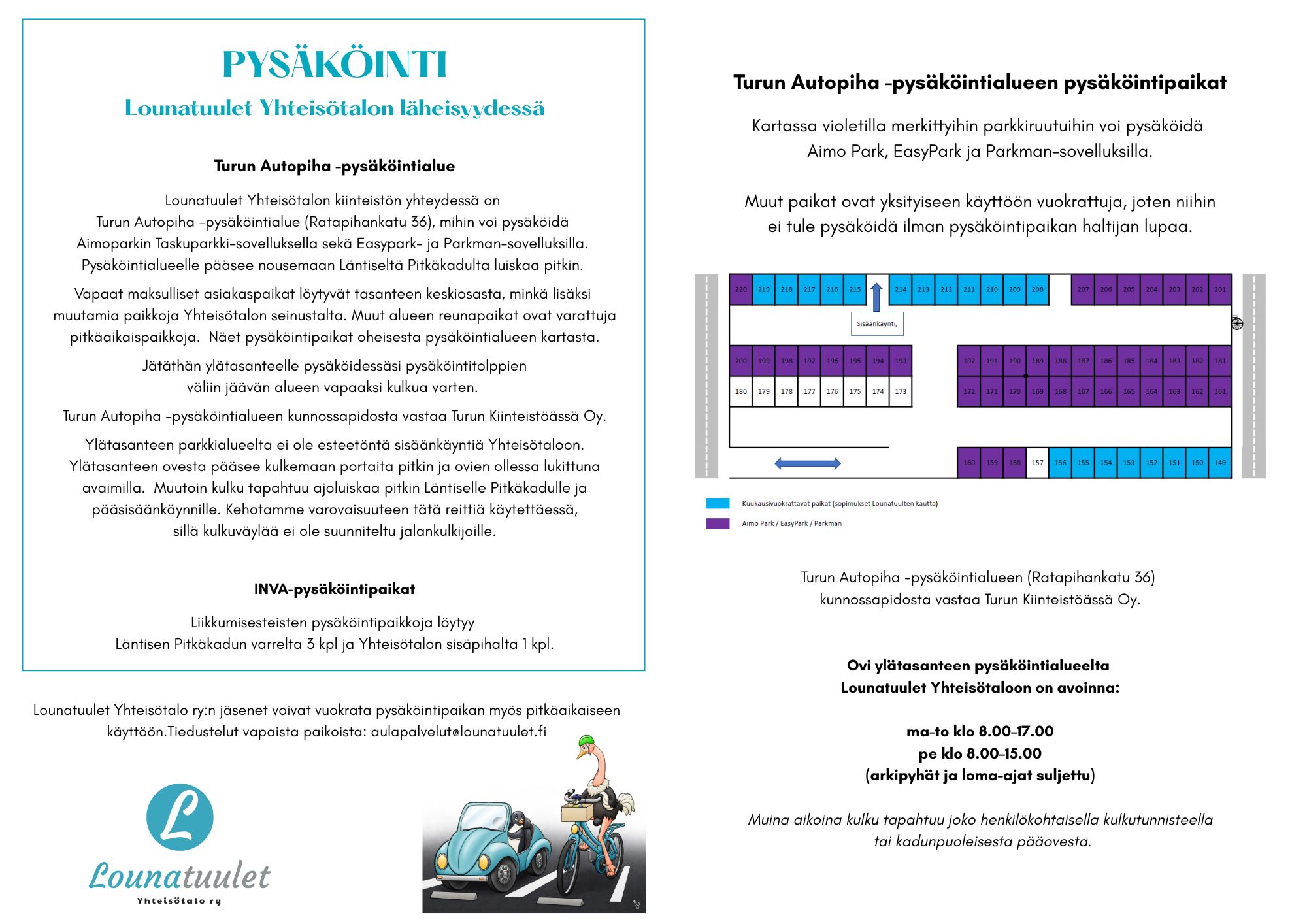 Lounatuulet Yhteisötalon kiinteistön yhteydessä sijaitsee Turun Autopiha -pysäköintialue (Ratapihankatu 36), mihin voi pysäköidä Aimoparkin Taskuparkki-sovelluksella sekä Easypark- ja Parkman-sovelluksilla. Pysäköintialueelle pääsee nousemaan Läntiseltä Pitkäkadulta luiskaa pitkin. Vapaat maksulliset pysäköintipaikat löytyvät tasanteen keskiosasta, minkä lisäksi muutamia paikkoja Yhteisötalon seinustalta. Muut alueen reunapaikat ovat varattuja pitkäaikaispaikkoja. Näet yleisessä käytössä olevat/varatut pysäköintipaikat oheisesta pysäköintialueen kartasta.